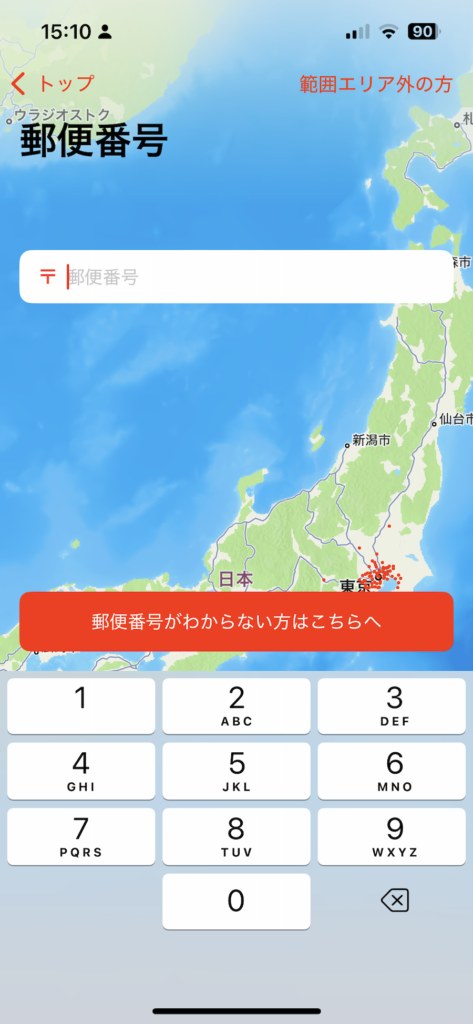 ↓OniGOアプリ内の配送エリア確認画面